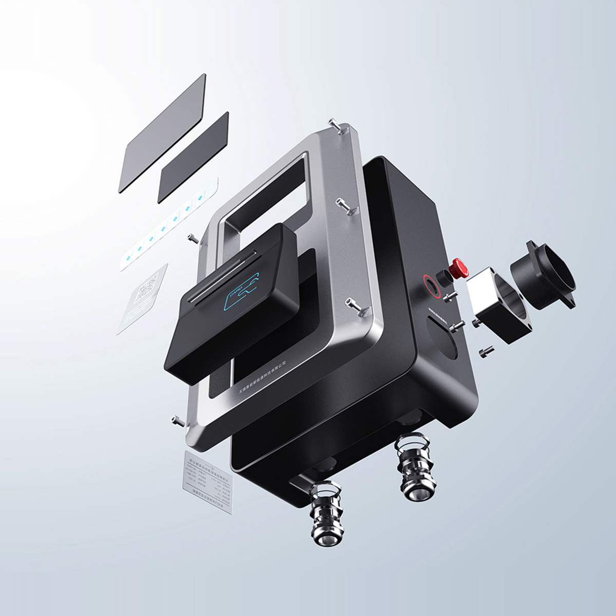 此款充電樁采用了大斜面的設(shè)計風(fēng)格,正面采用可替換的形式,便于不同的廠商進行使用。