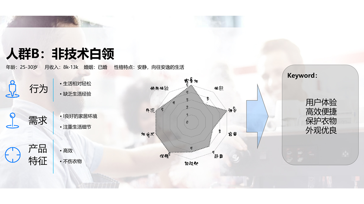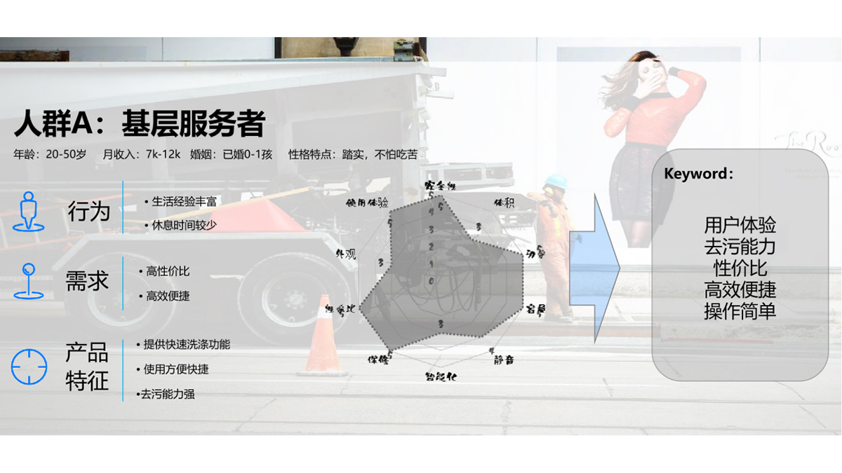 ? ? ? ? 滾筒洗衣機(jī)的普及很大程度擴(kuò)大了用戶群體,這要求團(tuán)隊(duì)需要從多個維度對人群進(jìn)行劃分和了解。從角色數(shù)據(jù)的角度,不同的職業(yè)決定了收入層次及消費(fèi)能力,從而影響滾筒洗衣機(jī)的定價(jià)。木馬團(tuán)隊(duì)深入研究劃分消費(fèi)者族群,將其分為基層服務(wù)者、非技術(shù)白領(lǐng)及商業(yè)服務(wù)業(yè)三類,分別剖析了者三類人群對于洗衣機(jī)的不同需求,并制作用戶畫像,如下圖。