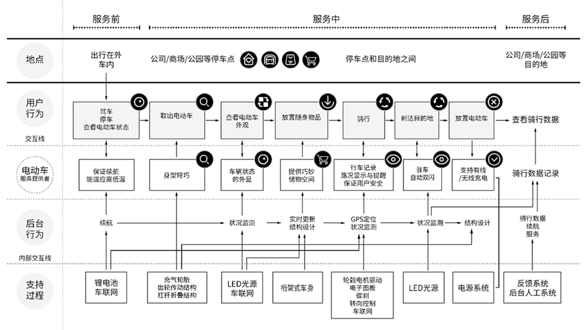? ? ? ? 設計團隊站在mini電動車的視角,把它看做一個人,去深入地拆解它會怎么看、怎么說、怎么和用戶互動,如何成為用戶的貼心行程伴侶。繪制用戶體驗地圖、服務藍圖是尋找優(yōu)化體驗服務點的有效工具,根據(jù)體驗流程圖中挖掘的機會點,從產(chǎn)品服務、環(huán)境和傳達等多方面設定設計所要達成的目標。