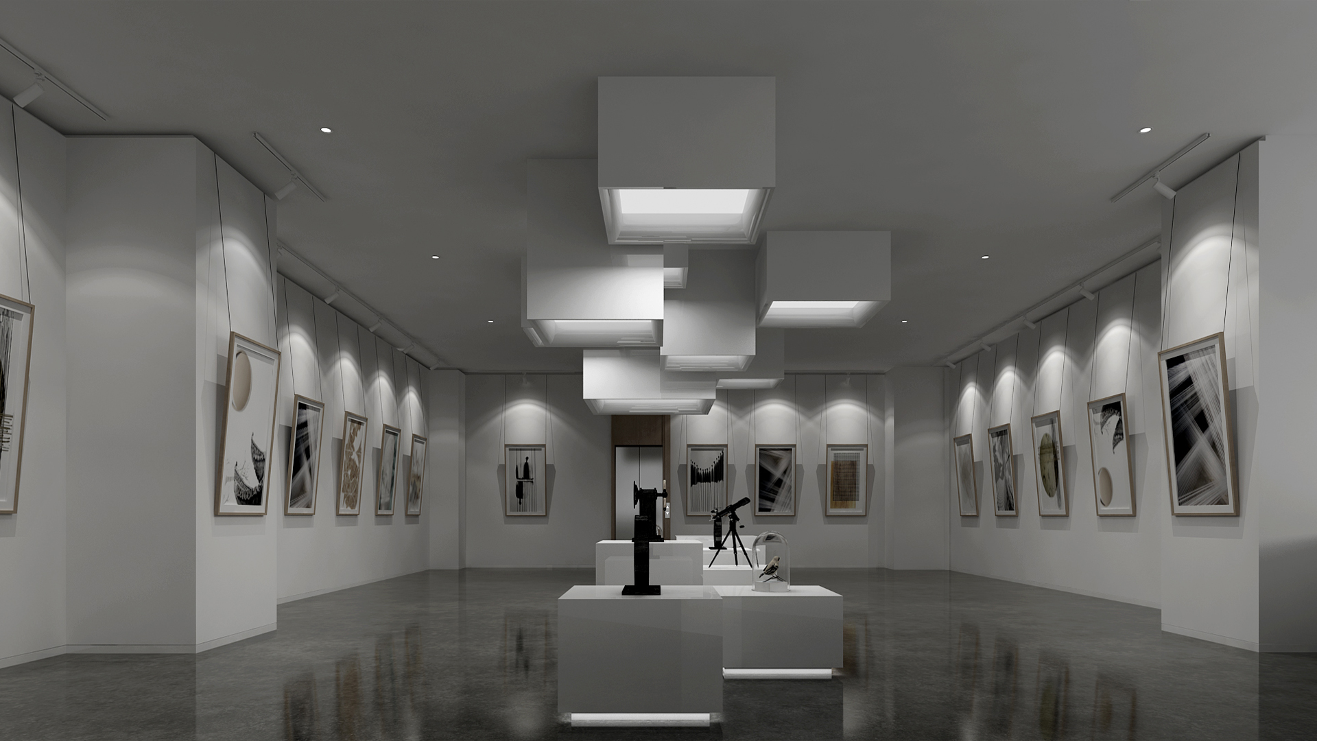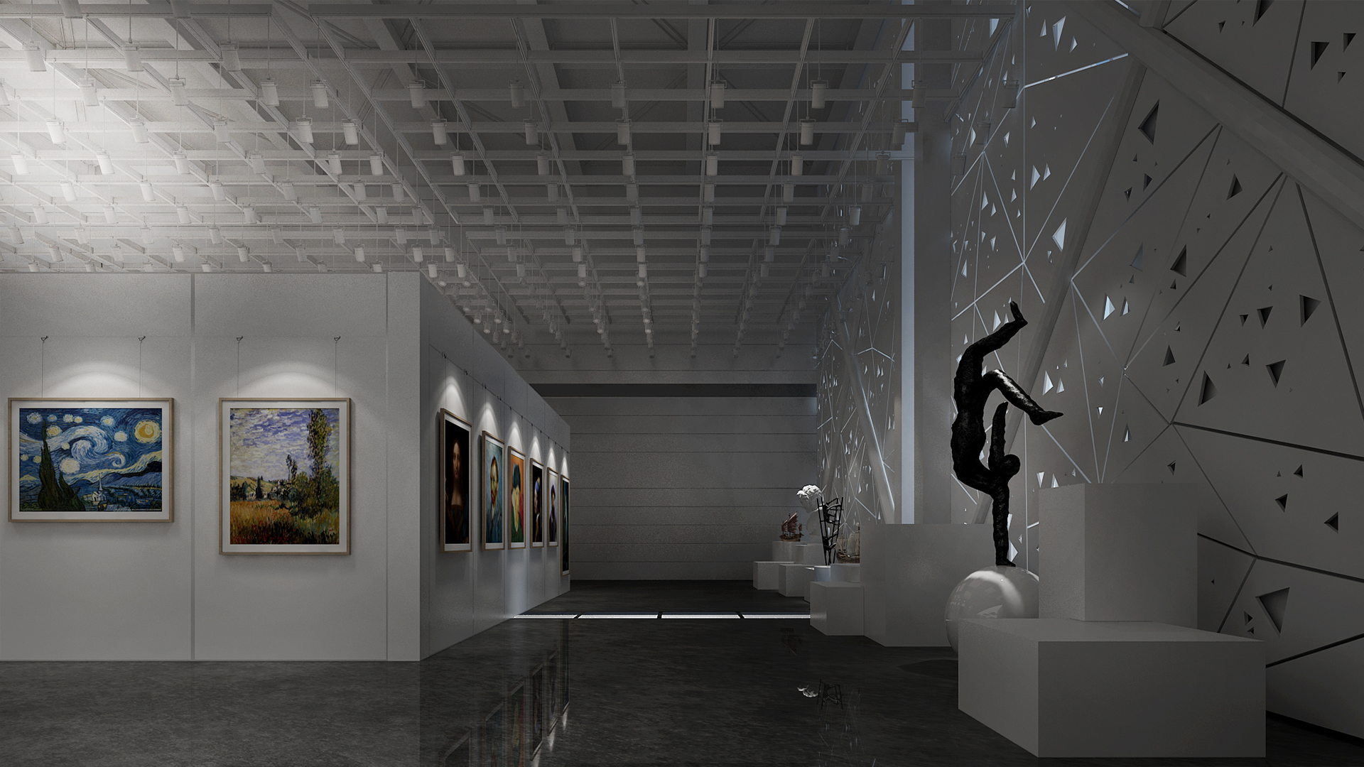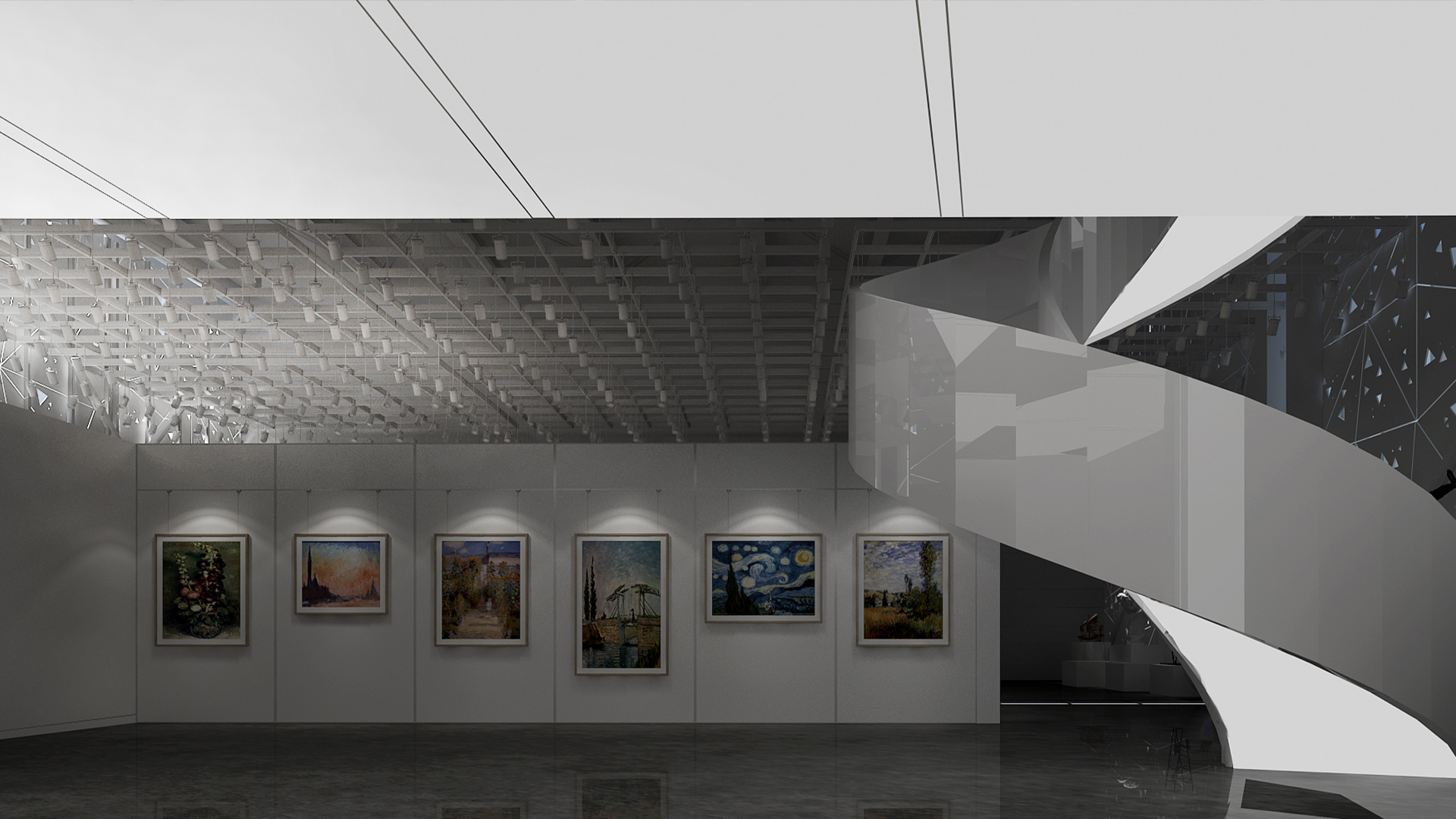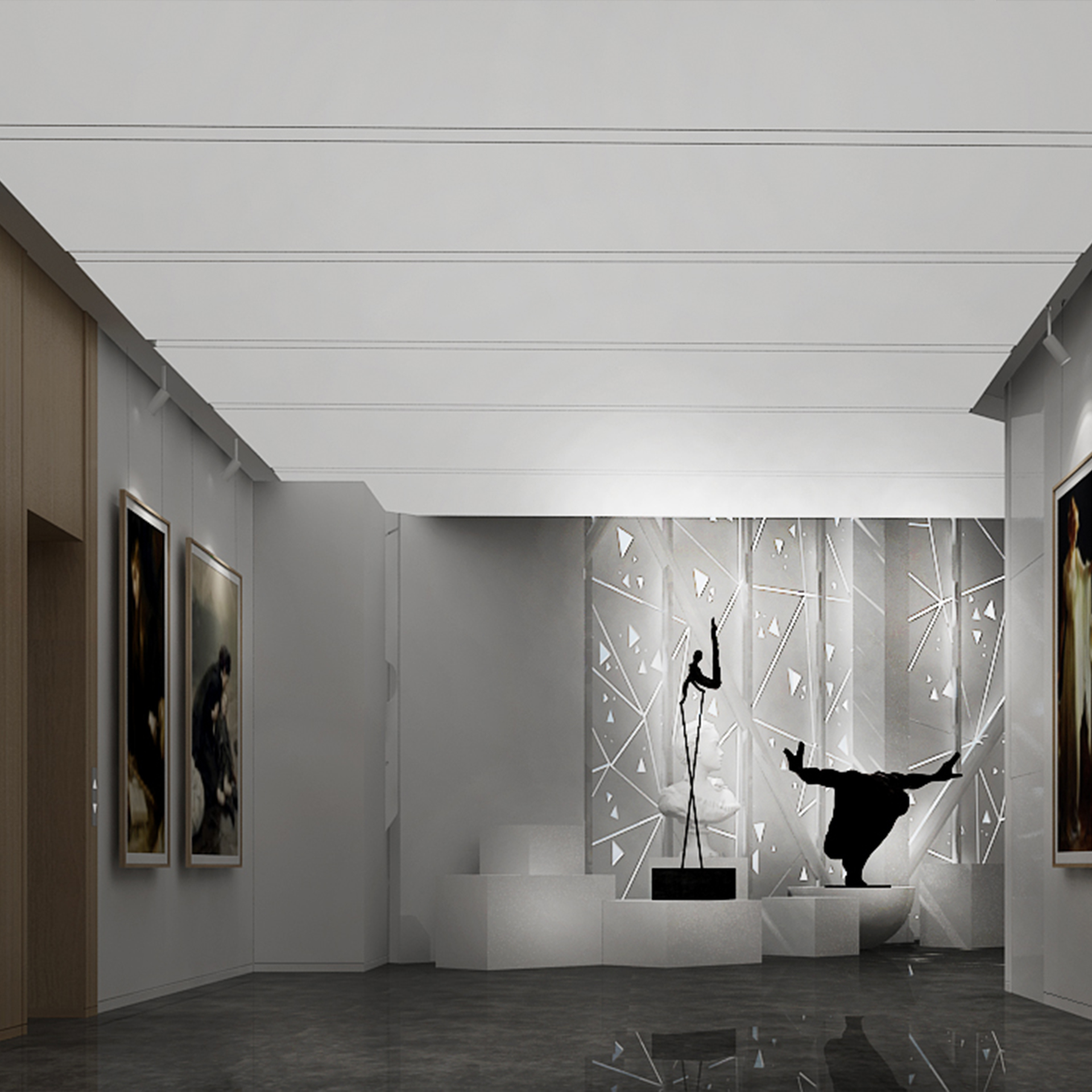 展館主要呈現(xiàn)黑白灰三色,黑白灰的色彩具有很高的審美價值,他們相互襯托,對比強烈,混合作用后會產(chǎn)生意想不到的藝術(shù)效果,產(chǎn)生千姿百態(tài)的節(jié)奏,極其富有韻律感和美感。這樣的空間不僅充滿情調(diào),更能襯托期間多彩的藝術(shù)品、豐富的畫作和內(nèi)涵的雕塑。