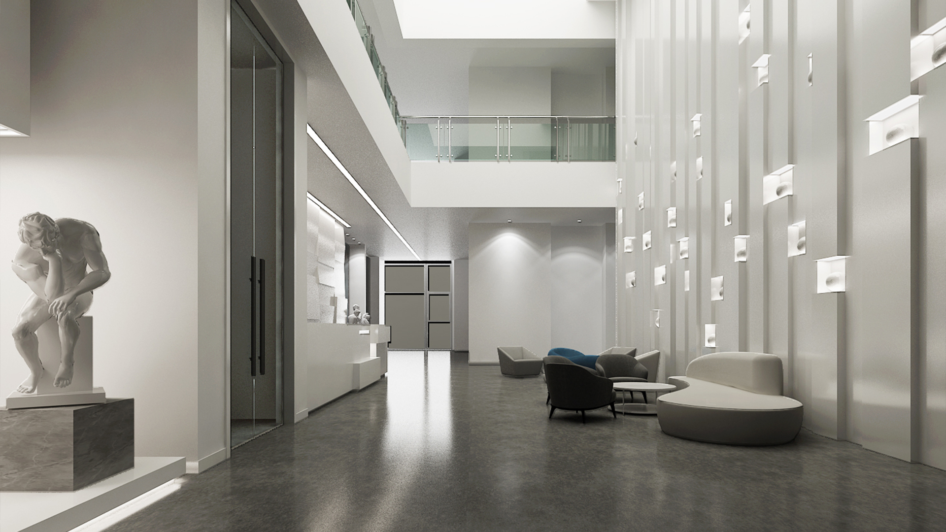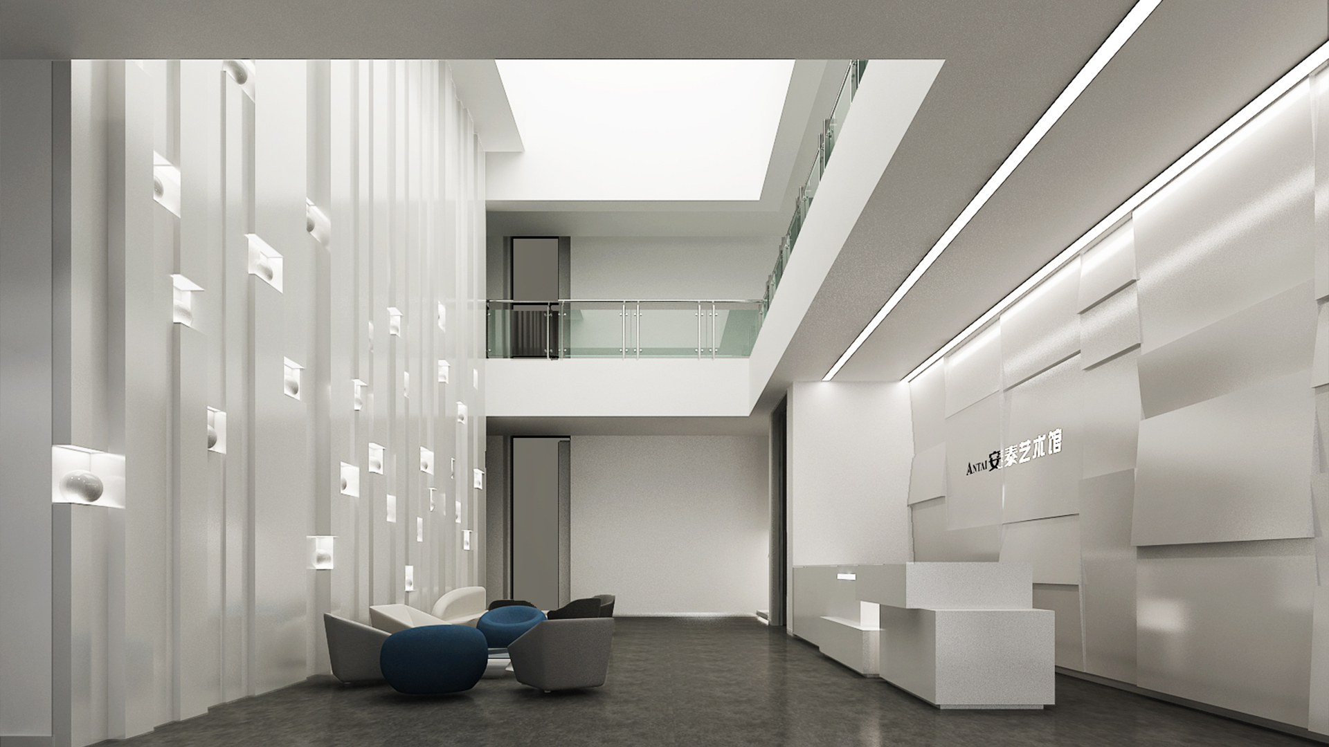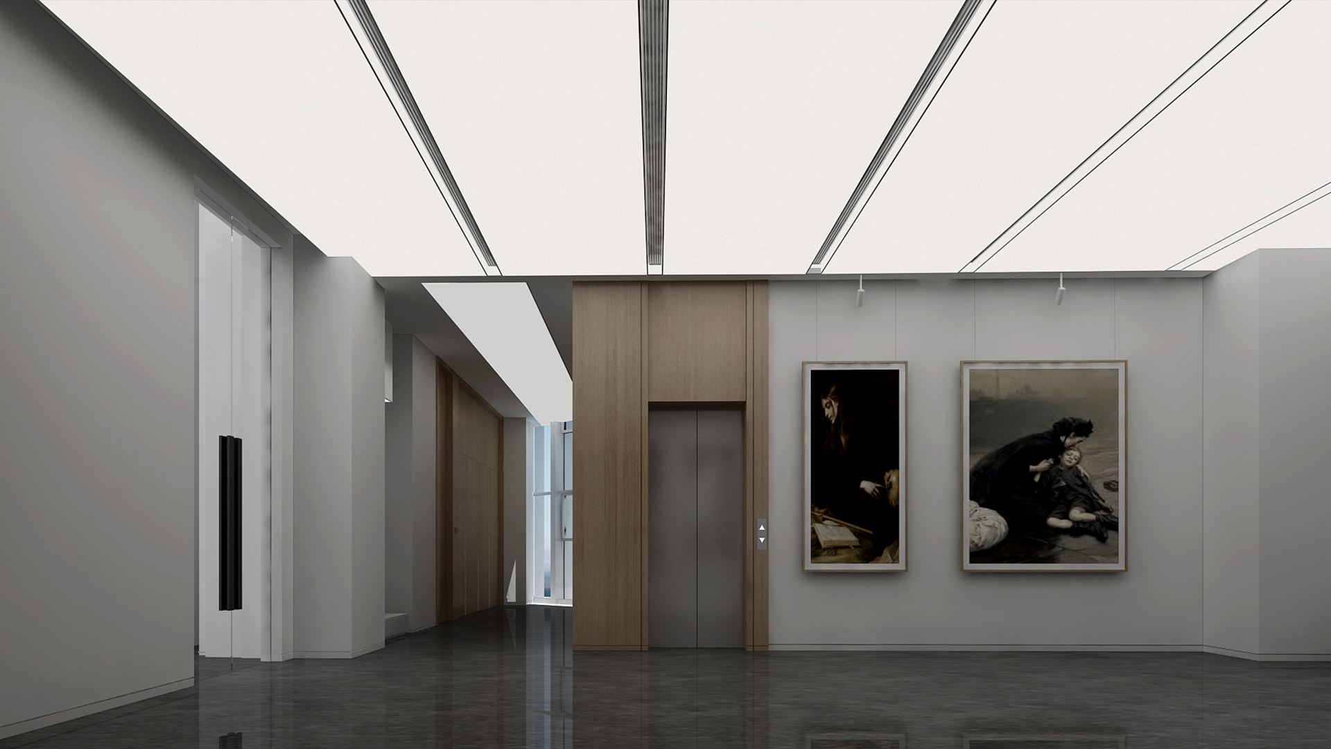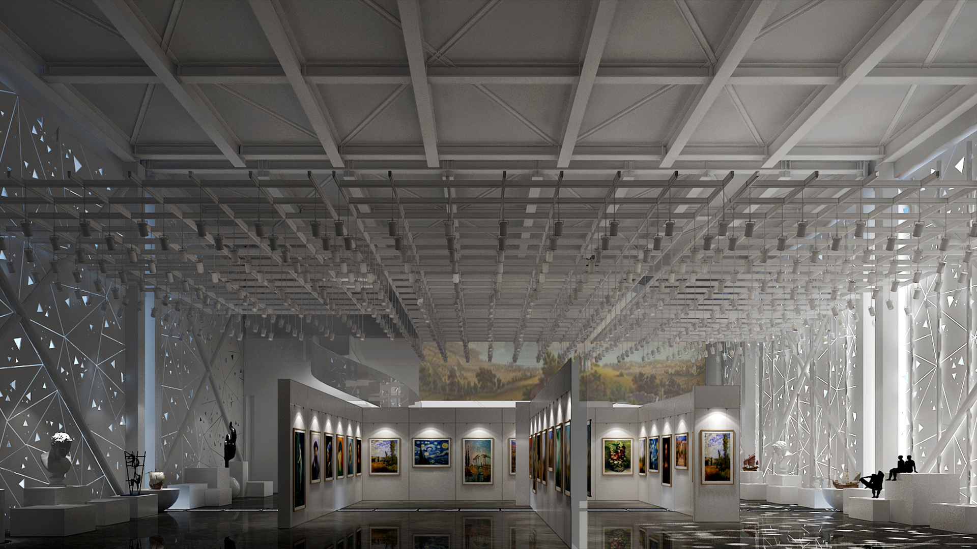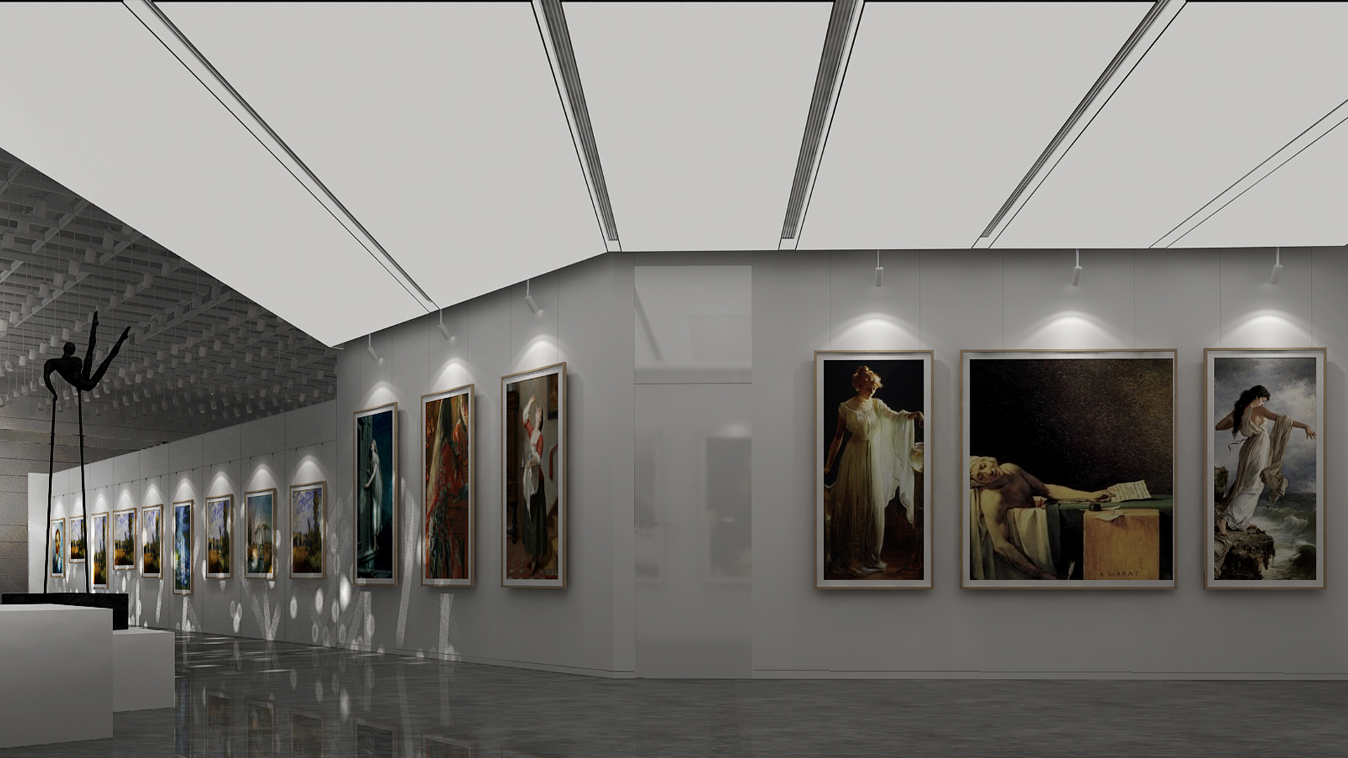 展館主要呈現(xiàn)黑白灰三色,黑白灰的色彩具有很高的審美價值,他們相互襯托,對比強烈,混合作用后會產(chǎn)生意想不到的藝術(shù)效果,產(chǎn)生千姿百態(tài)的節(jié)奏,極其富有韻律感和美感。這樣的空間不僅充滿情調(diào),更能襯托期間多彩的藝術(shù)品、豐富的畫作和內(nèi)涵的雕塑。