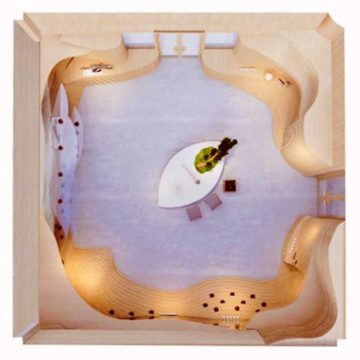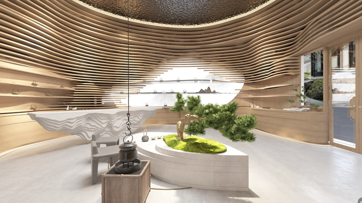 整體空間的靈感來(lái)自于自然地形——梯田, 所塑造的自然成型的層次。決定了人與動(dòng)物行走,相遇,交談,互動(dòng)的生態(tài)。茶葉本身也是從這個(gè)大自然采集而來(lái),整體思路是希望空間能夠跳脫常規(guī)四四方方的死板規(guī)范,因?yàn)槲覀兊氖澜缡橇鲃?dòng),曲面,不定性的。回歸自然,我們本該將自然界元素融會(huì)貫通,改變我們體驗(yàn)商業(yè)跟人互動(dòng)的形態(tài),才能從底層反應(yīng)茶這件事請(qǐng)的本質(zhì)。
