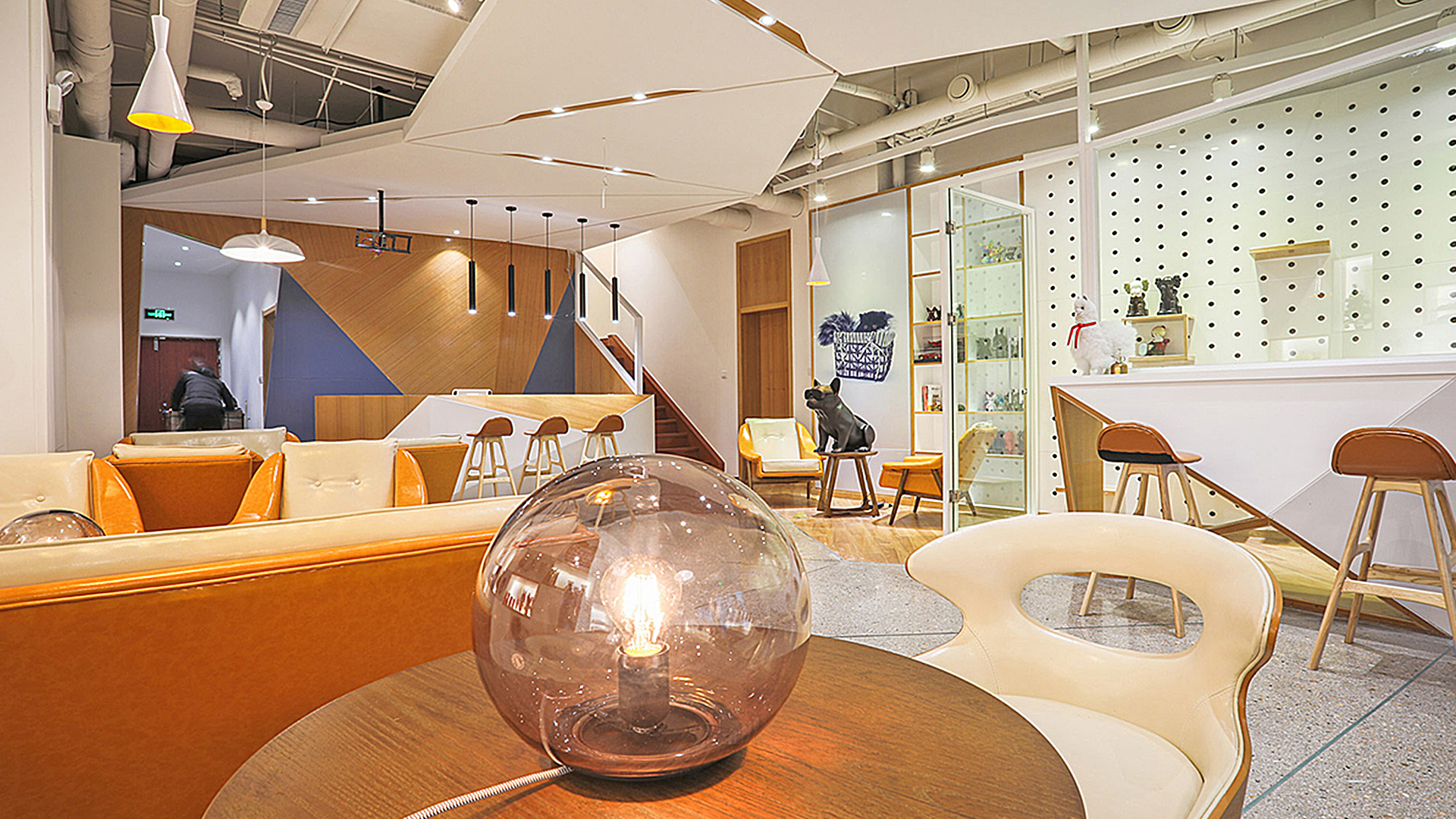 這次的設(shè)計,我們將重新詮釋寵物店的含義,社區(qū)門口的寵物店不能只是一家寵物美容或者寵物用品的小超市,而更應(yīng)注重休閑生活氛圍體驗,形成養(yǎng)寵物人們之間能夠進行話題交流的場所,為這些熱愛生活,熱愛寵物的人們提供家一樣的感受??臻g以暖黃色作為主色調(diào),以及一系列寵物裝飾造型,都很好的表現(xiàn)出店鋪的“溫馨度”,讓顧客到店體會到的不僅僅是專業(yè)、放心,更多了一份溫暖。設(shè)計師在大門出設(shè)計了一個櫥窗,偶然經(jīng)過的路人透過櫥窗,里面的溫馨場景一目了然。