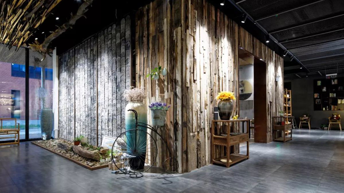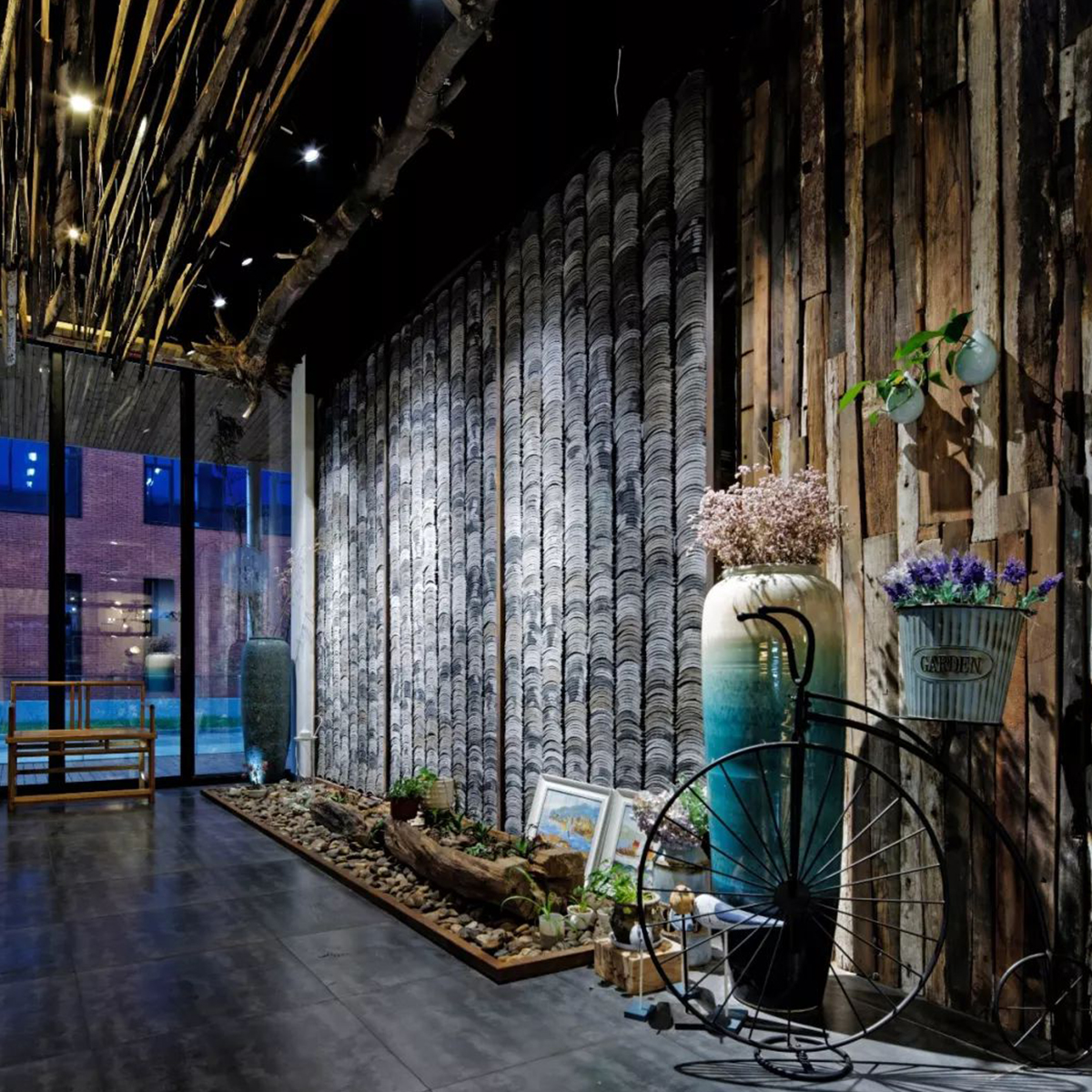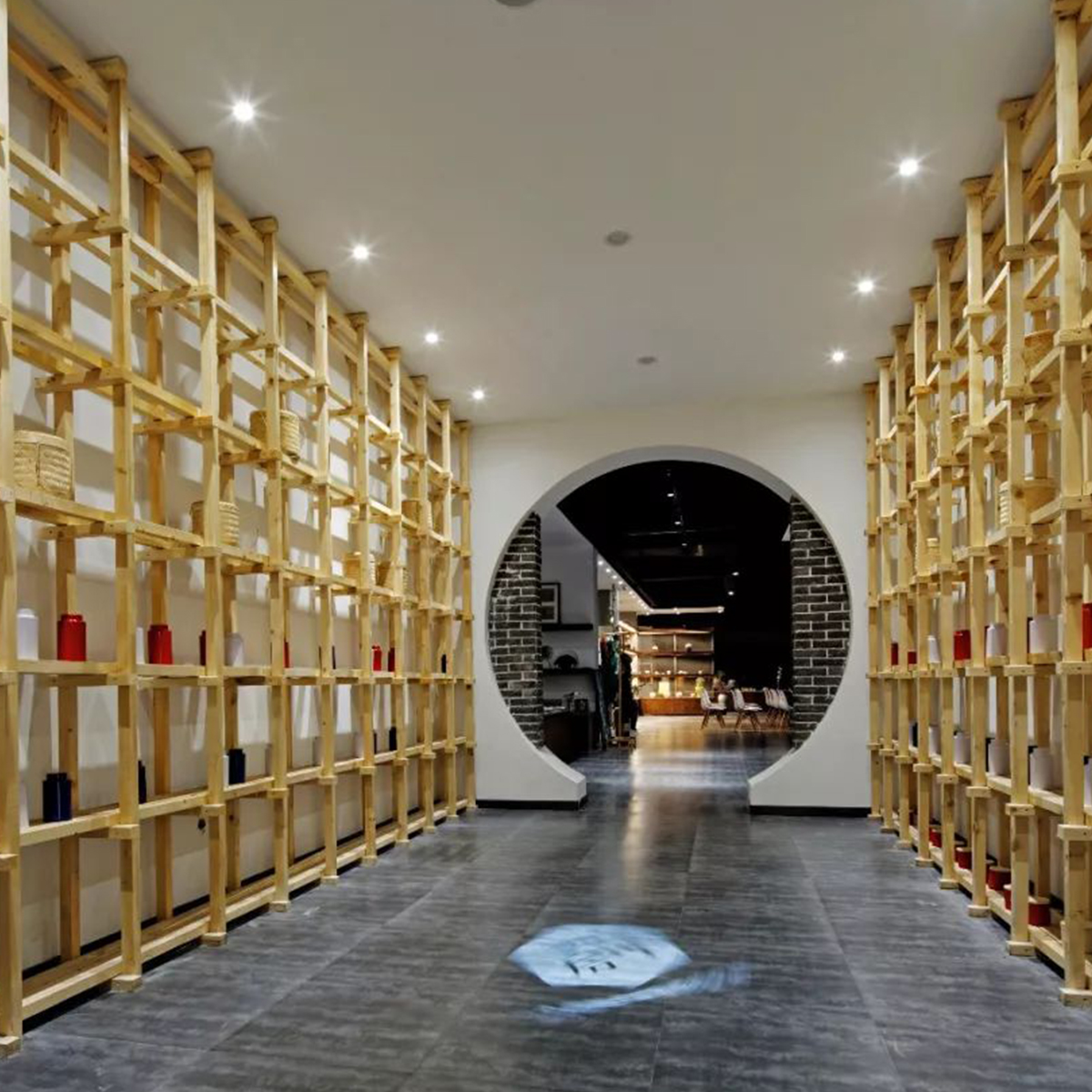 咖啡館空間利用了較多天然的材質和簡單錯落的形式,成就純粹的空間氛圍,使空間產(chǎn)生生長的自然張力。設計中不刻意追求材料的豪華和變化,著重幾種特定材質的相互穿插運用,以形成空間的有機和豐富。在虛實空間的處理上,運用園林借景的手法,通過圓洞門構成空間紐帶,使得整個空間虛實有序、渾然一體。