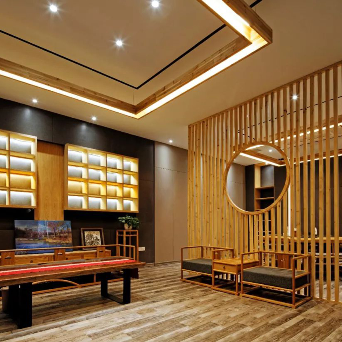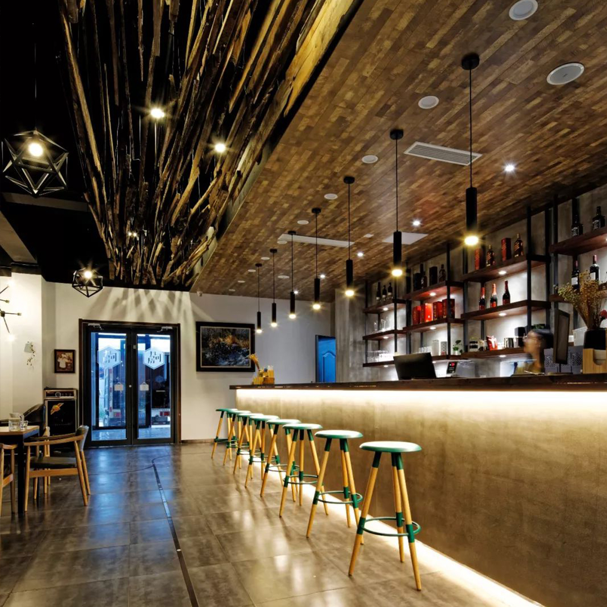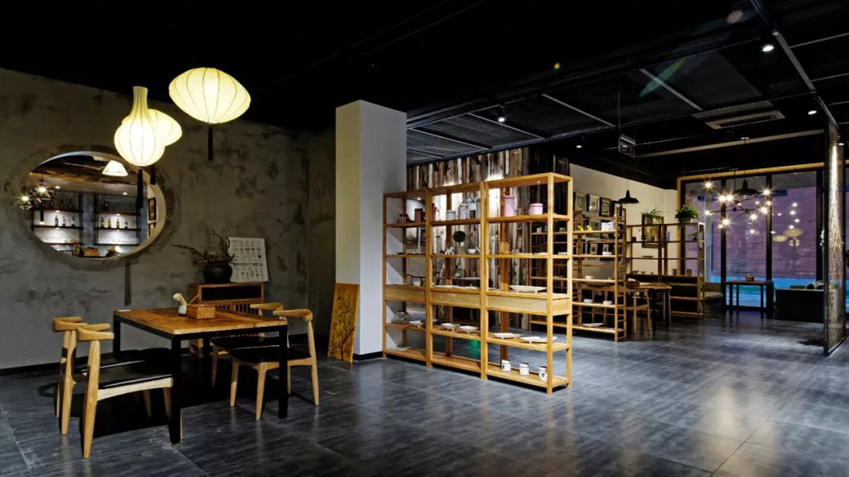咖啡館空間利用了較多天然的材質和簡單錯落的形式,成就純粹的空間氛圍,使空間產(chǎn)生生長的自然張力。設計中不刻意追求材料的豪華和變化,著重幾種特定材質的相互穿插運用,以形成空間的有機和豐富。在虛實空間的處理上,運用園林借景的手法,通過圓洞門構成空間紐帶,使得整個空間虛實有序、渾然一體。