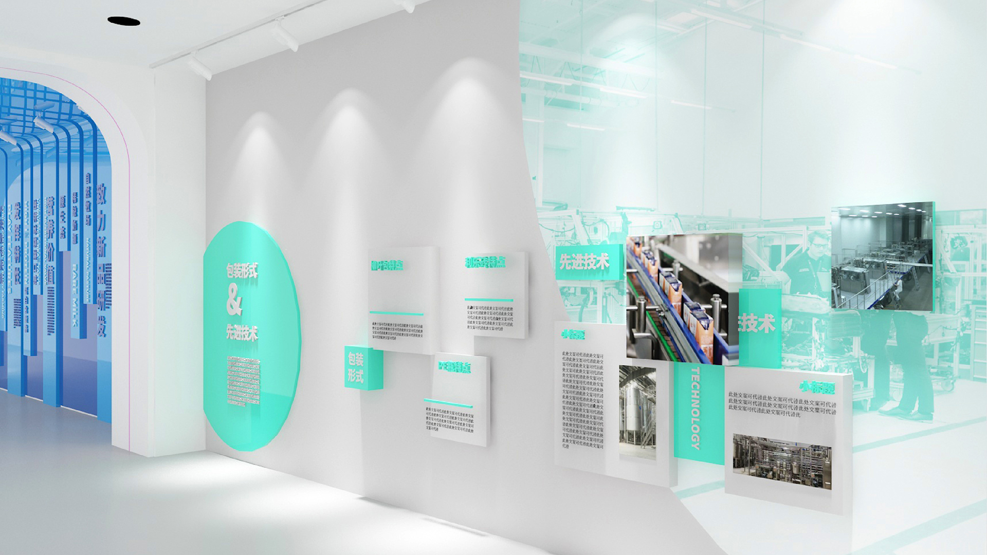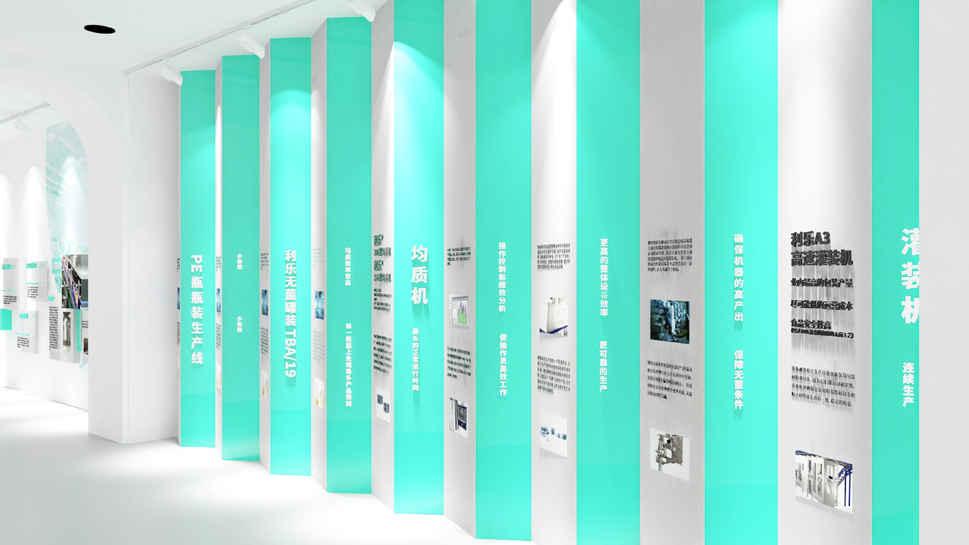 總控室后的玻璃,因為參觀走廊顏色比較豐富,考慮到如果這里也做色彩或者比較復雜的設(shè)計,會造成是視覺混亂,所以我們把這扇玻璃上的遮擋裝飾設(shè)計成和墻面一樣的白色,放上slogan,這樣整體比較統(tǒng)一自然。