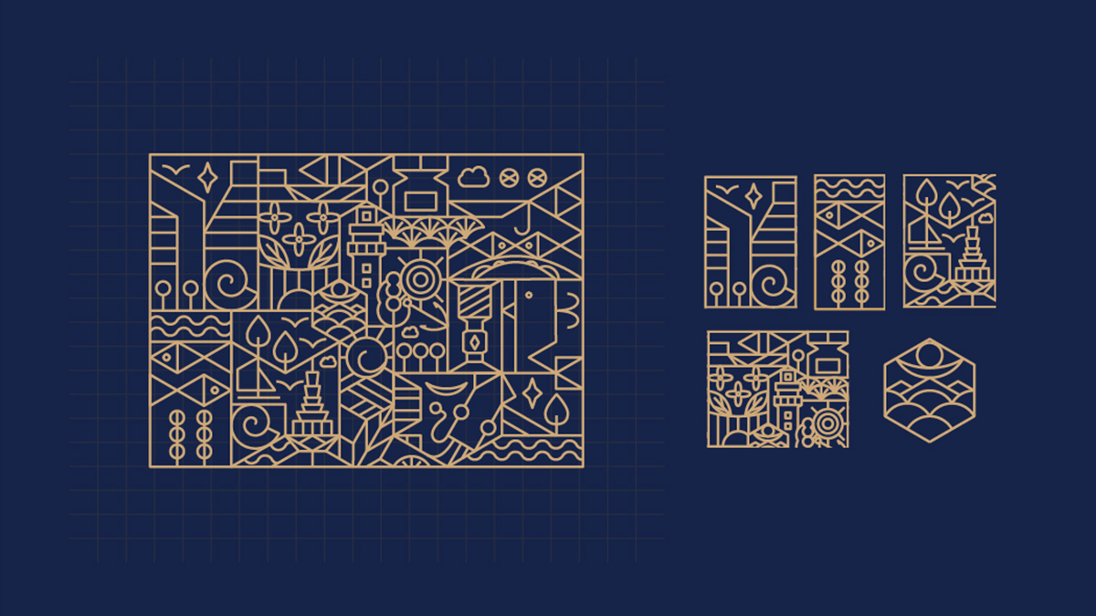 以logo為創(chuàng)意中心,發(fā)散延伸出完整的輔助畫面,組成更大的圖形。其基本構成元素來自于日照的標志性建筑與城市文化特色相關元素,延續(xù)線性繪畫手法以保持風格統(tǒng)一,豐富品牌視覺表現(xiàn)力,強化品牌形象,以便于后期VI應用衍生。