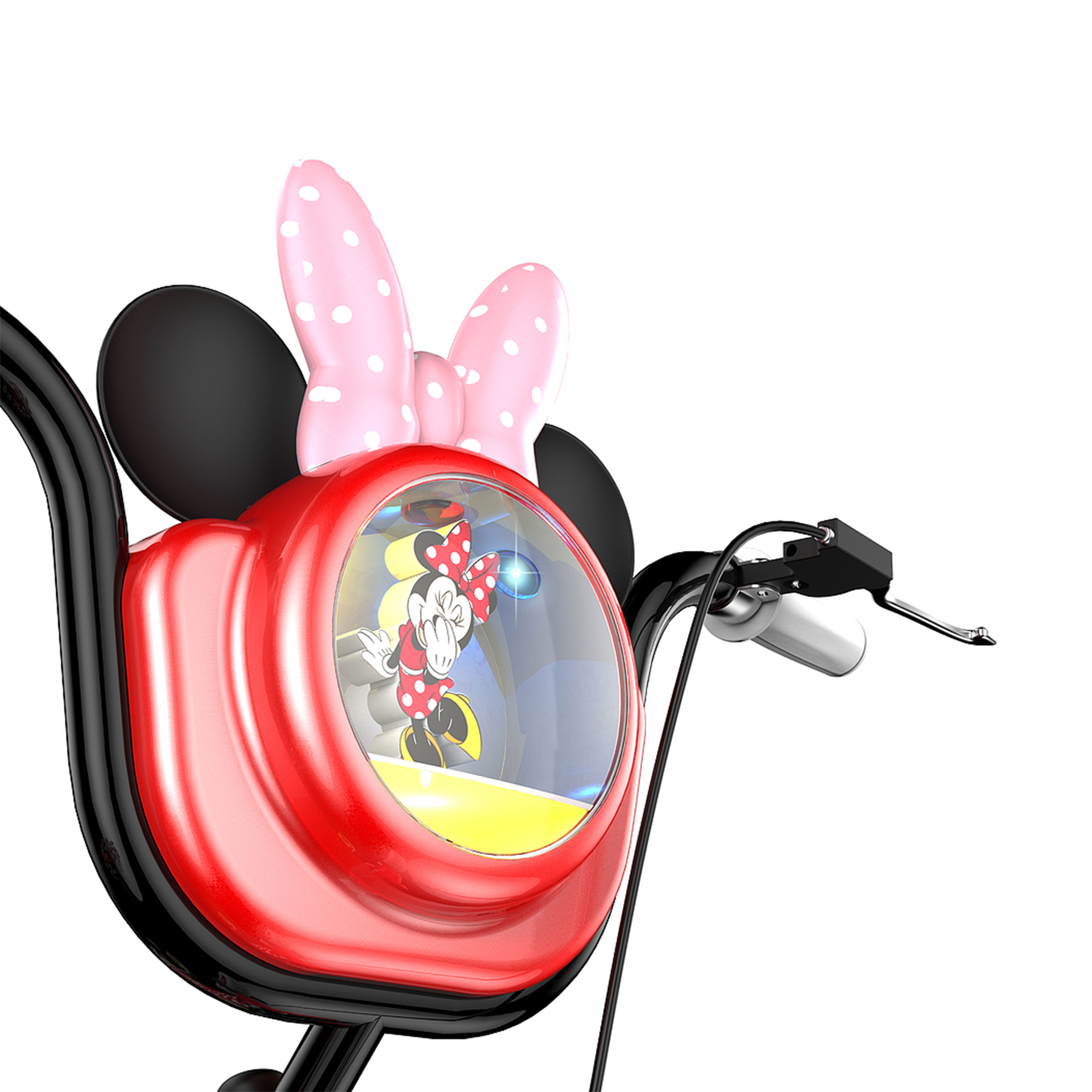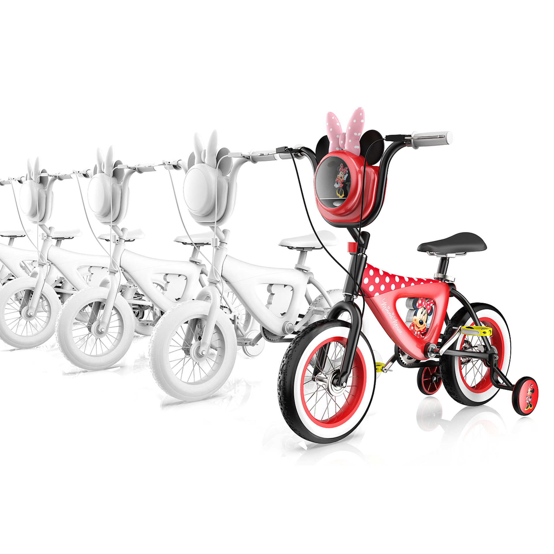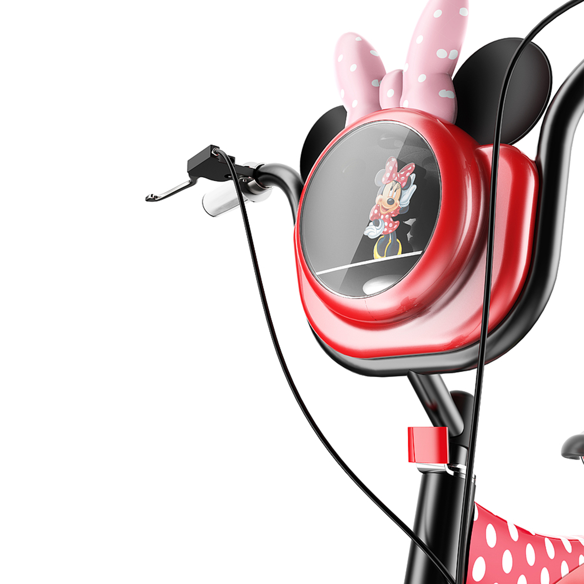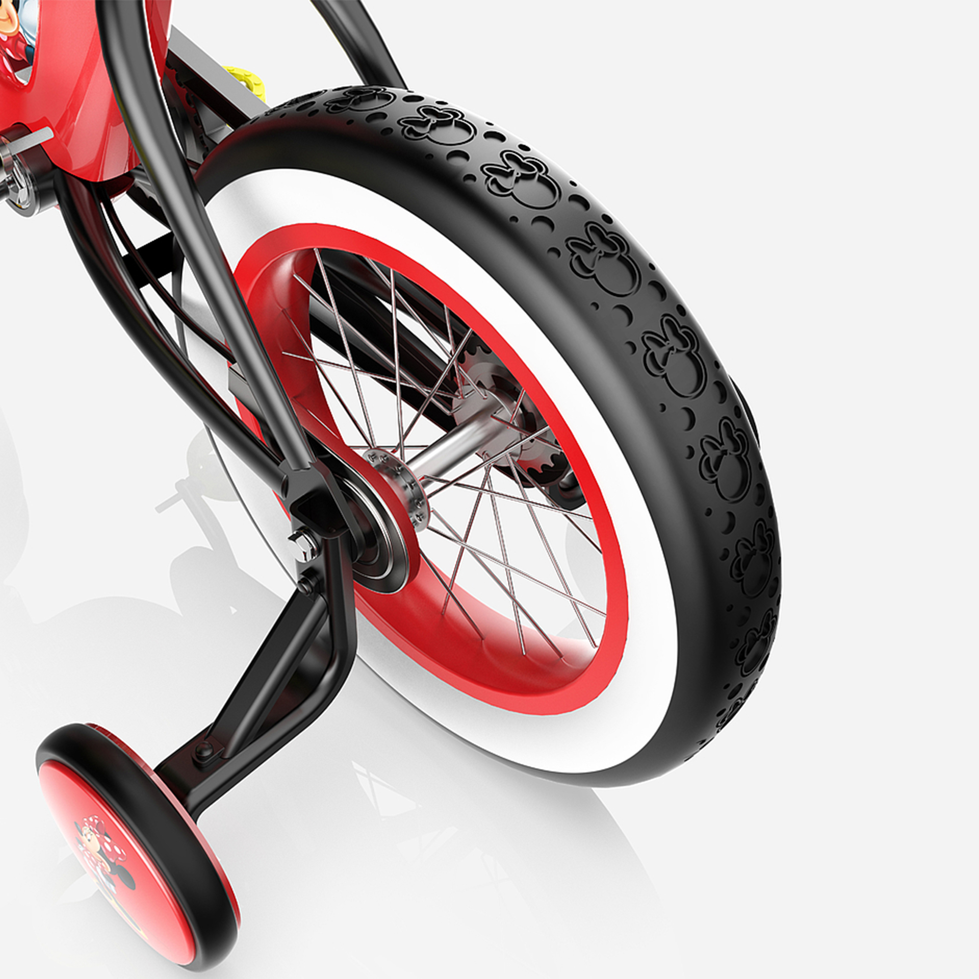 輔助輪與車架中部印有米妮肖像圖案,象征米妮始終陪隨在孩子左右,車胎印有米妮老鼠頭像紋理,象征米妮與孩子一路同行、共同成長.