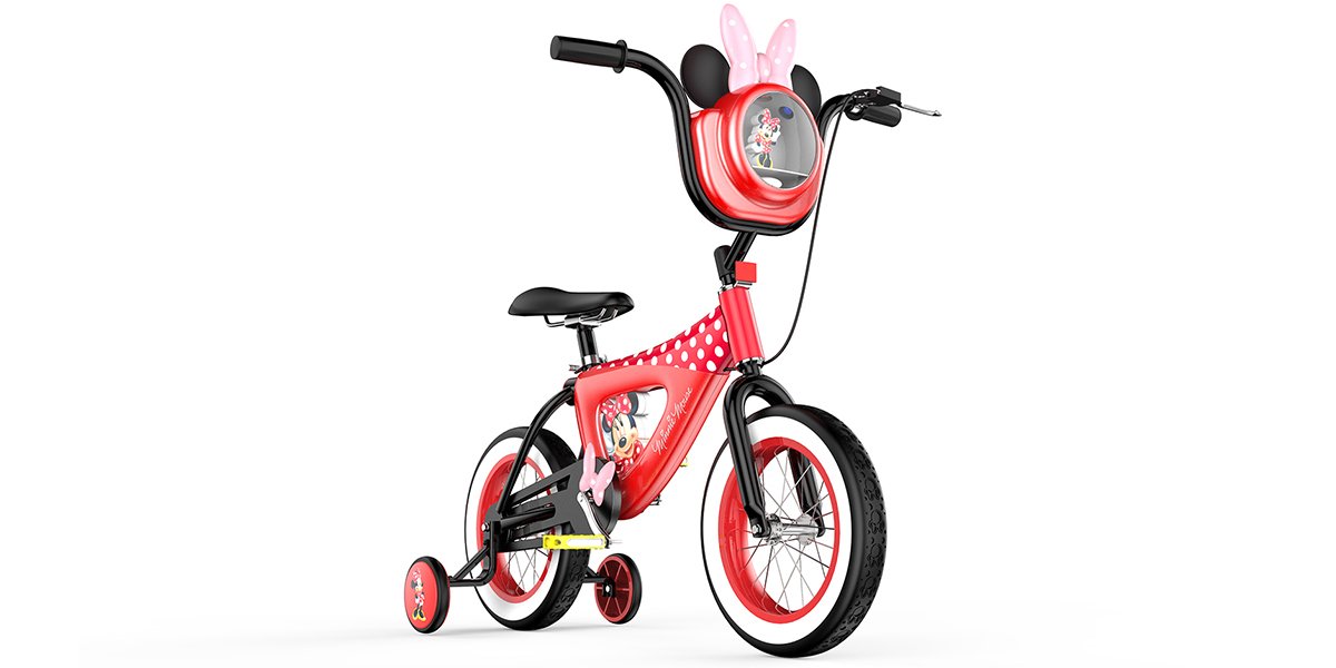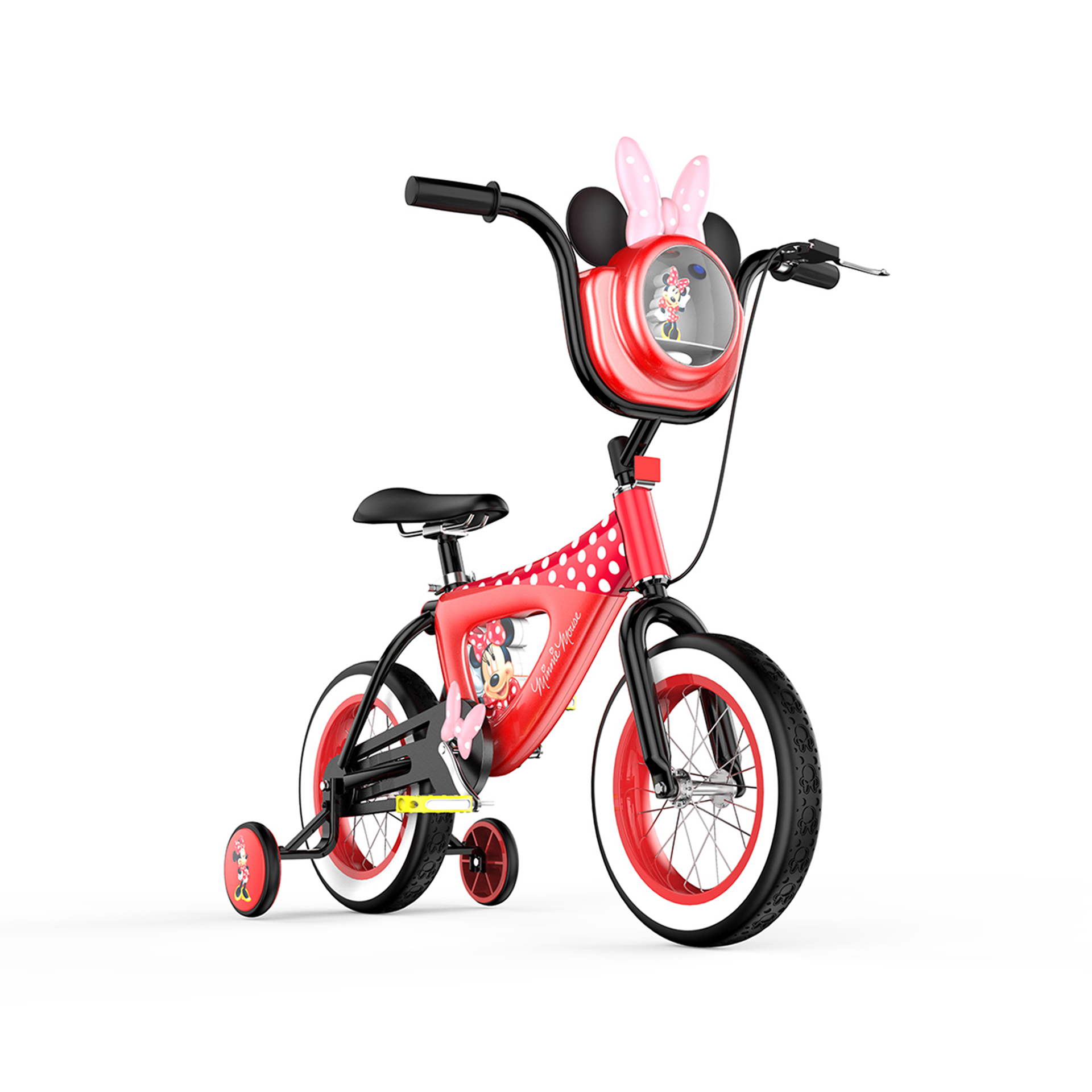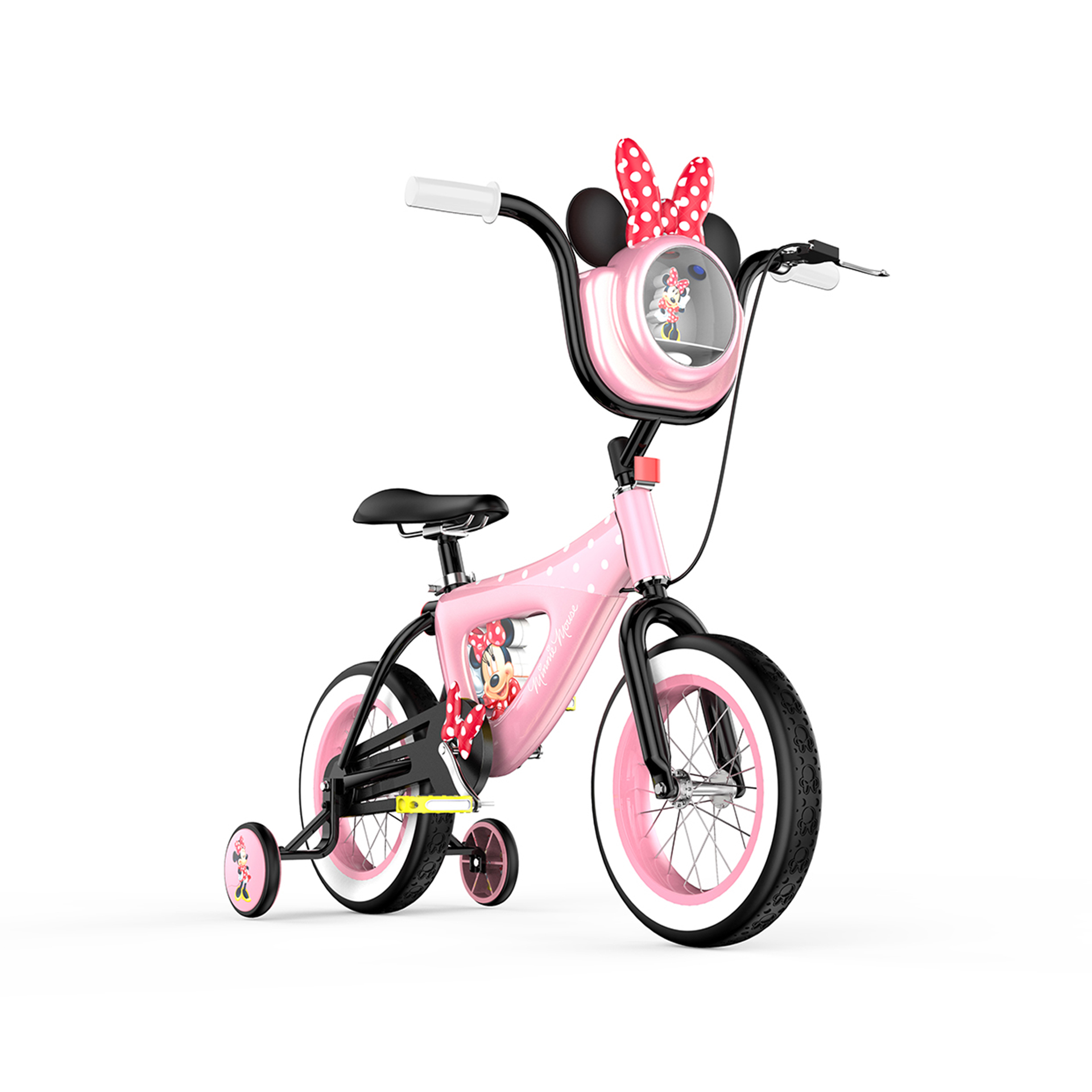 輔助輪與車架中部印有米妮肖像圖案,象征米妮始終陪隨在孩子左右,車胎印有米妮老鼠頭像紋理,象征米妮與孩子一路同行、共同成長.
