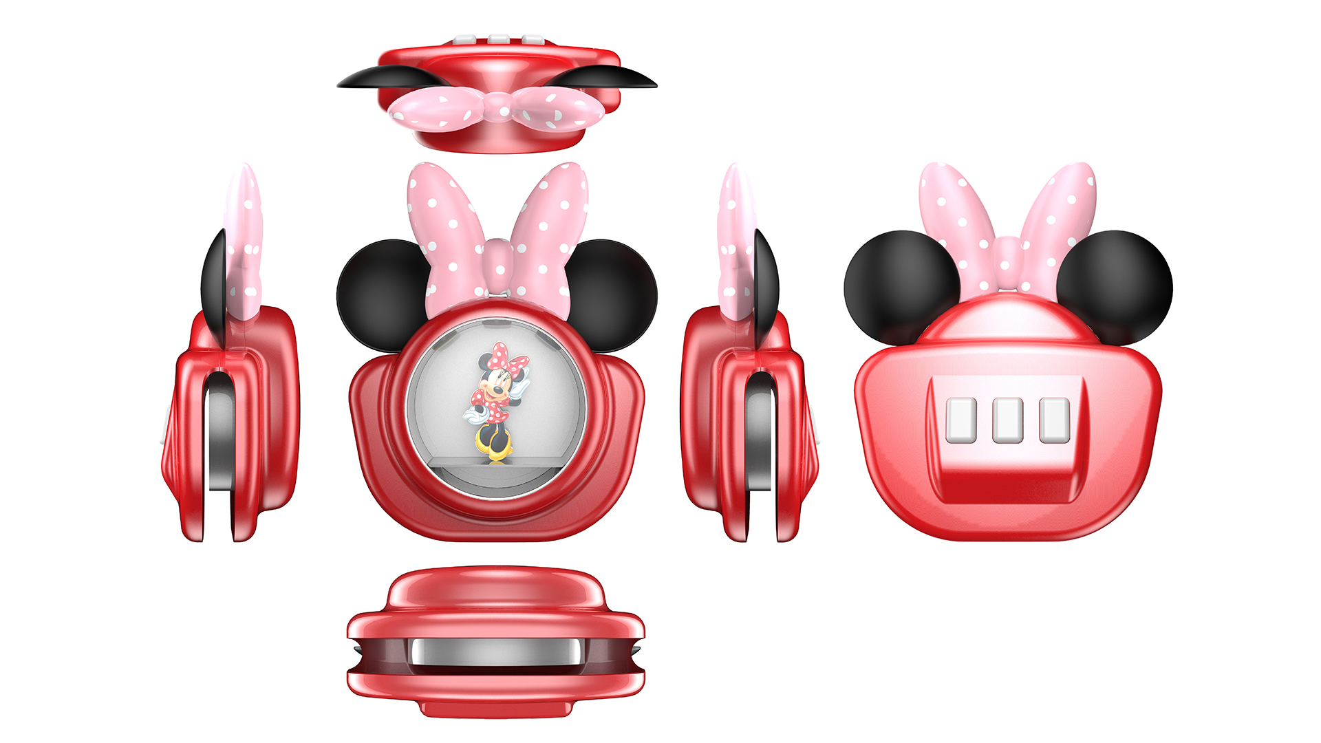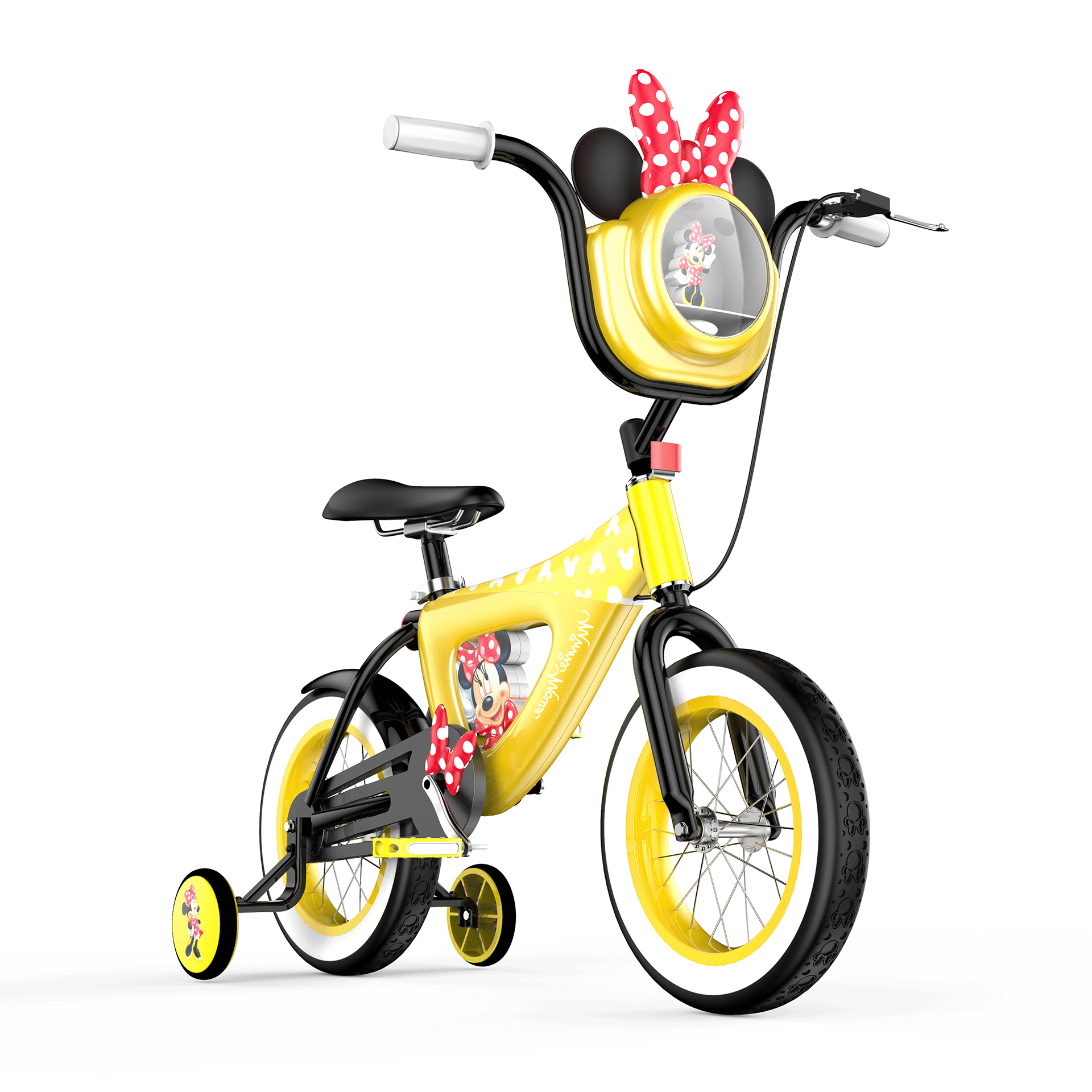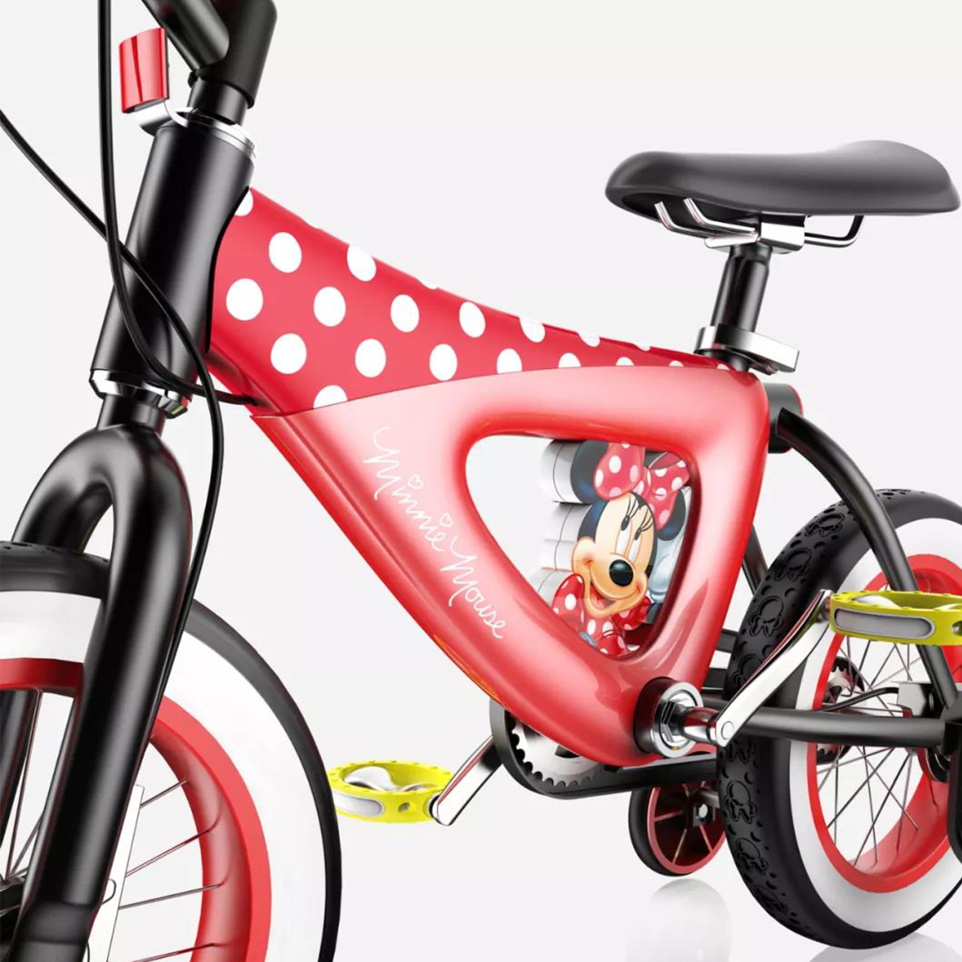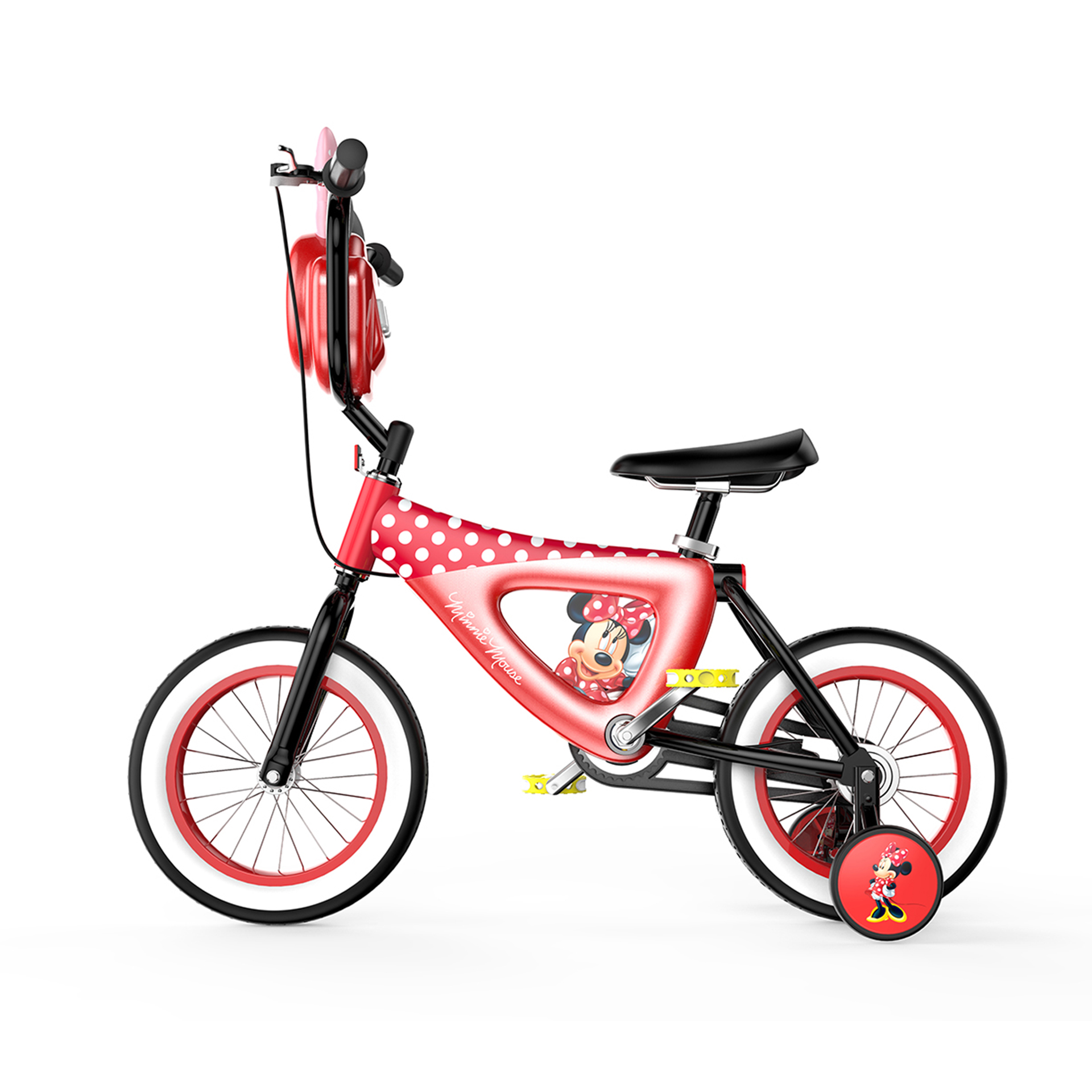輔助輪與車架中部印有米妮肖像圖案,象征米妮始終陪隨在孩子左右,車胎印有米妮老鼠頭像紋理,象征米妮與孩子一路同行、共同成長.