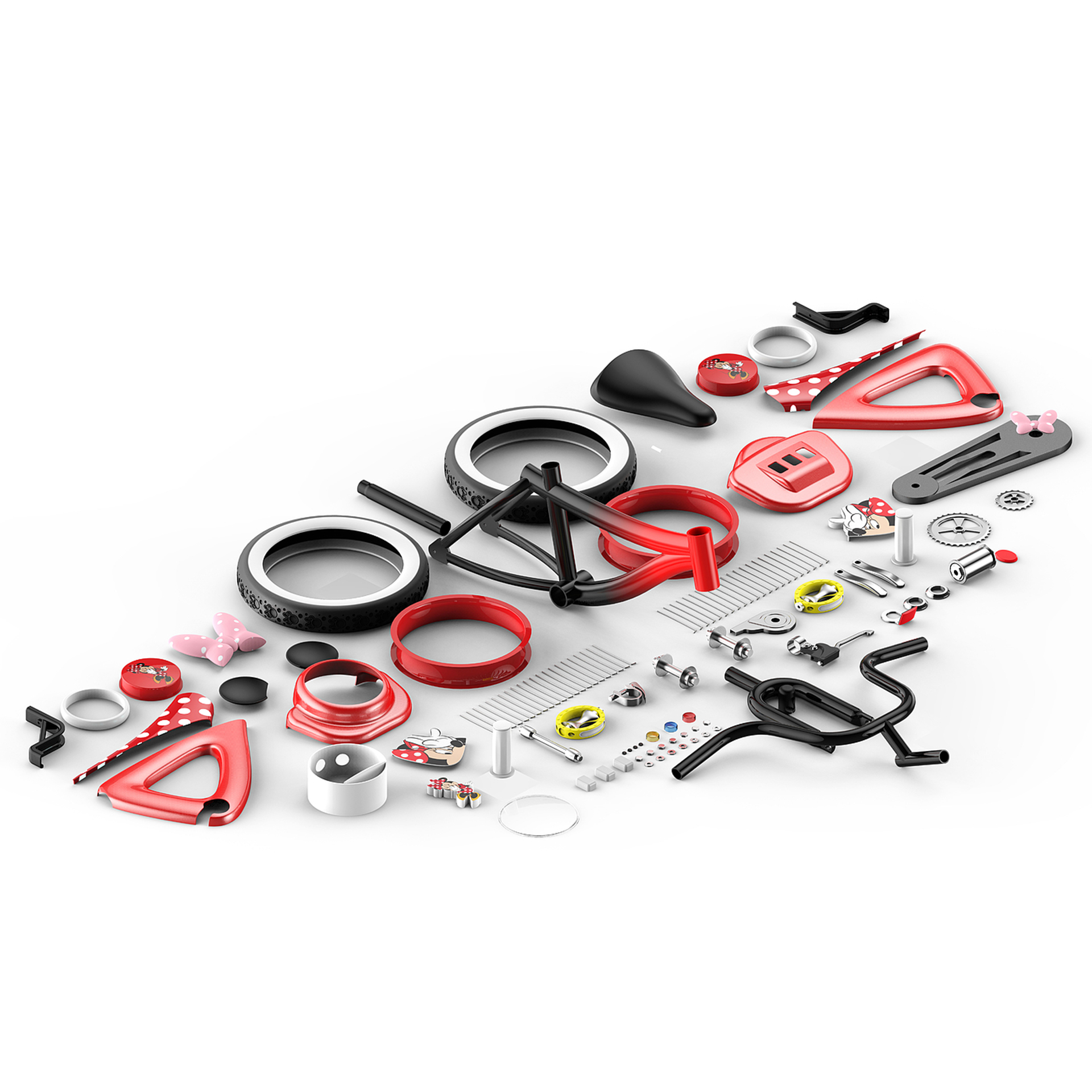 呼應(yīng)米妮充滿童趣的卡通形象,車架設(shè)計成飽滿有機的形態(tài),迎合孩子們喜歡的親和可愛風格,配以紅色及白斑點紋理,象征米妮的紅色連衣裙,讓米妮形象融入車體的造型中,三角形穩(wěn)固設(shè)計,為孩子騎行安全多添一份保障。